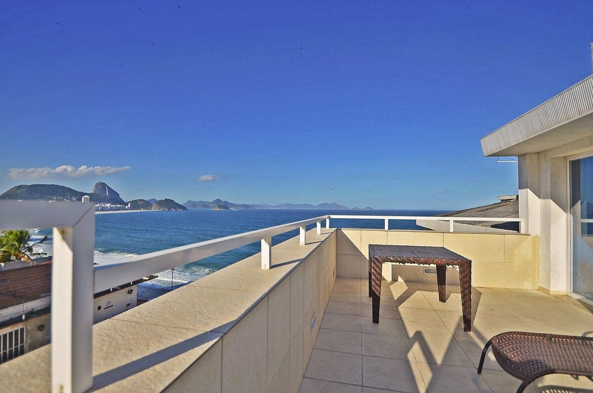 Precioso ático con 4 dormitorios y vistas frente al mar y la playa de Copacabana en Río de Janeiro. Hermosa terraza con jacuzzi y espectaculares vistas de la playa y el Pan de Azúcar. ¡Tiene capacidad para 9 personas! Ático con jacuzzi en Río con 170m², divididos en salón, cuatro dormitorios (3 suites), 4 baños, cocina y terraza. Todas las habitaciones están equipadas con cama de matrimonio, TV LCD y aire acondicionado. Ático con jacuzzi en Río con cinco televisores LCD (por cable), Internet inalámbrico y caja fuerte. El salón cuenta con un sofá cama y mesa de comedor. Vista panorámica (frontal) del mar y de la playa de Copacabana. La terraza ofrece un gran jacuzzi. Ubicado en el piso 12 de un edificio seguro con vigilancia las 24 horas. A sólo 30 metros de la famosa playa de Copacabana. Este ático con jacuzzi en Rio es una gran opción de alojamiento para familias y grupos.